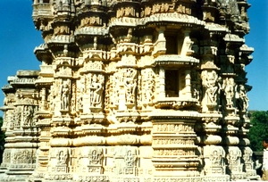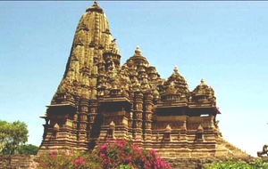 With a graded rise secondary shikharas (spires) cluster to create appropriate base for the main shikhara over the sanctum. Kandariya Mahadeva, one of the most accomplished temples of the Western group, comprises eighty-four shikharas, the main being 116 feet from the ground level. These shikharas - subordinate and main, attribute to the Khajuraho temples their unique splendor and special character. With a graded rise of these shikharas from over the ardhamandapa, porch, to mandapa, assembly hall, mahamandapa, principal assembly hall, antarala, vestibule, and garbhagraha, sanctum sanctorum, Khajuraho temples attain the form and glory of gradually rising Himalayan peaks.
